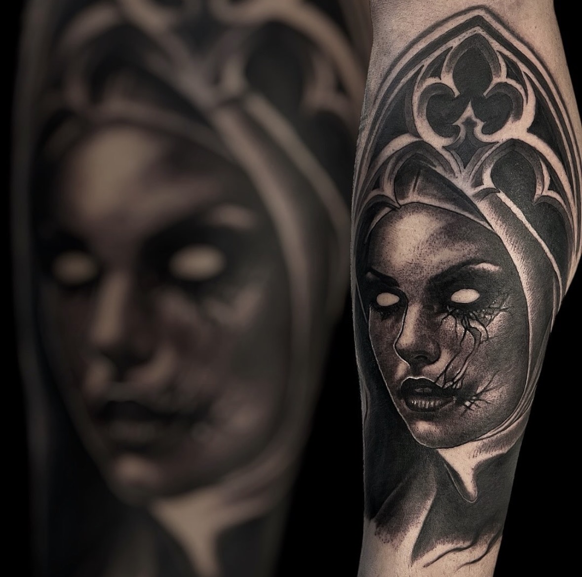 This style, which delves into the depths of gothic and horror aesthetics, uses hyper-realistic techniques to bring chilling scenes and figures to life on the skin.